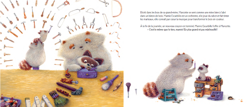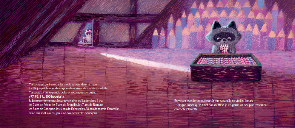 Nous terminons avec Marcotte : le voleur d’anniversaire, de Nejma Bourouaha, publié chez Didier Jeunesse, un album poétique et tendre qui aborde la peur de grandir à travers l’histoire d’un raton laveur qui vole les bougies d’anniversaire de sa famille pour qu’elle ne vieillisse pas.