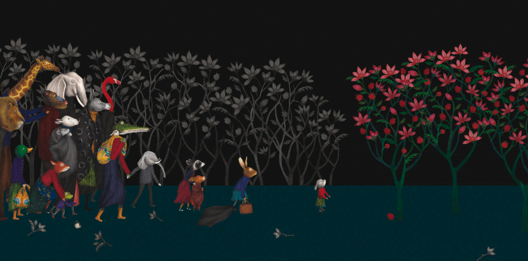 Ce qui frappe d’emblée au contact de cet album au format carré, lauréat du Prix Sorcières 2021, c’est le contraste entre la noirceur de l’arrière-plan, renforcé par la tristesse des animaux présents en couverture, et les couleurs primaires, vives, qu’on retrouve sur les habits de ces mêmes personnages anthropomorphisés. Ce contraste, on le rencontre tout au long de l’album, puisque la couleur noire, ainsi que la détresse et la tristesse des personnages, dominent, au point où l’intrigue est ponctuée de la présence d’une allégorie de la mort, petit squelette gris à la cape colorée qui rôde en fidèle compagnon. Migrants, c’est en fait l’histoire d’un groupe d’animaux anthropomorphisés – girafe, éléphant, oie, lapin, grenouille, lion, toucan, ours, canard, etc. – qui passe par différentes étapes emblématiques du parcours migratoire. Ainsi, les animaux, déplacés, se dirigent vers un avenir incertain, où existe la possibilité d’être à nouveau en sécurité. Symboliquement, leurs mouvements et leurs regards tristes se dirigent toujours vers la droite de l’album (cf. l’image de couverture), suggérant le déplacement. Hormis les habits et les objets qu’ils possèdent, tous les personnages restent anonymes et leur histoire personnelle inconnue du lecteur, accentuant ainsi la dimension universelle l’album.