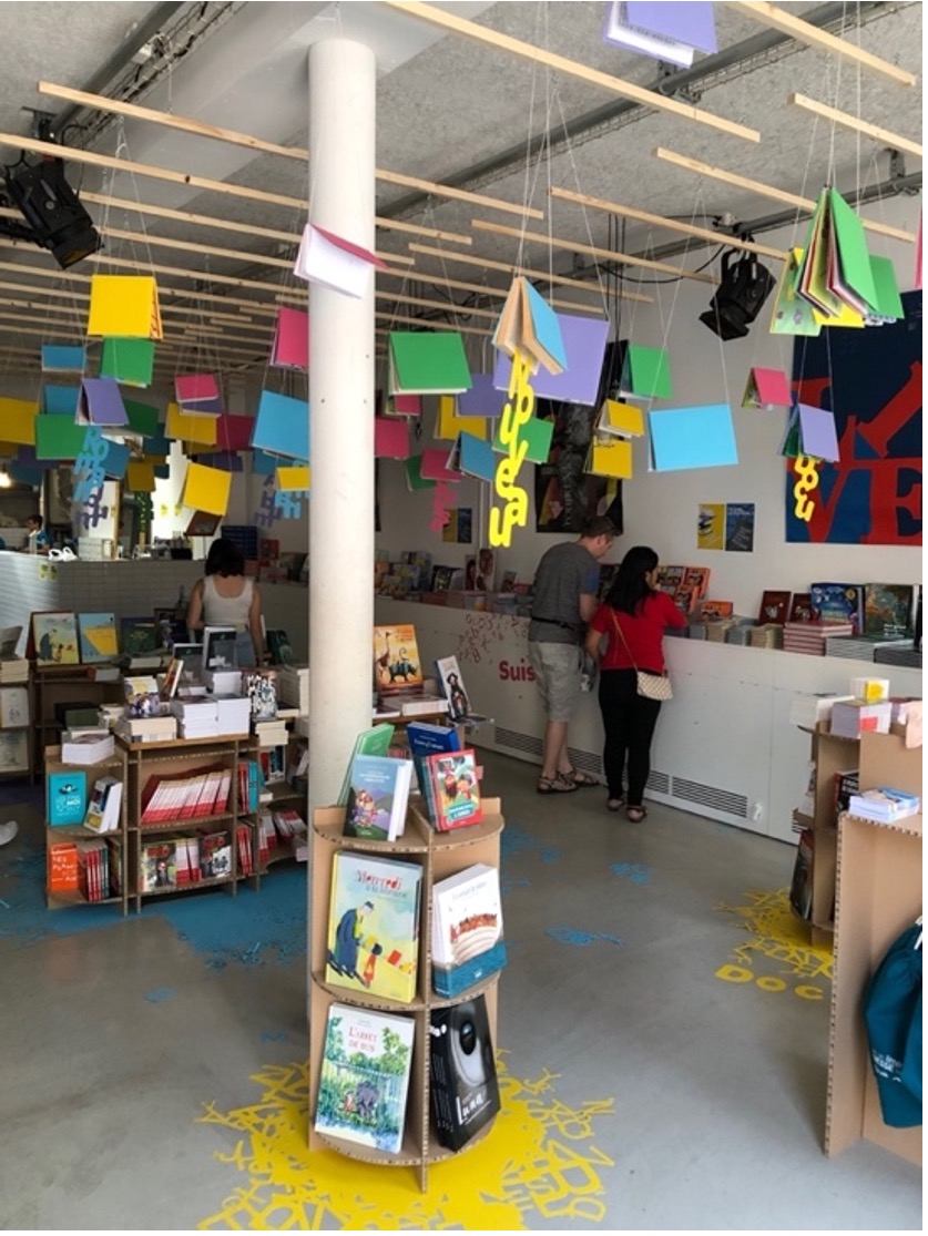 Tout a commencé quelques jours plus tôt par la soirée de rencontre entre bénévoles. L’occasion d’une part, de rencontrer les femmes à l’origine du festival, Violaine Vidal et Nathalie Guisolan et de l’autre, l’ensemble des bénévoles. Je découvre ainsi des gens d’horizons différents, entre bibliothécaires, enseignants, graphistes, conteuses, … tous se retrouvent à travers leur intérêt pour la littérature jeunesse créant ainsi une atmosphère chaleureuse et bienveillante. C’est également en amont du festival que j’ai pu découvrir les lieux choisis pour le weekend : le Théâtre de l’Oriental, la Cour de la Valsainte, la Librairie l’Imprudence, le bord du quai Entre-Deux-Villes et un magnifique jardin privé. Tous proches et fournissant un cadre idyllique au festival. Le premier endroit qui a apporté un air de magie a été le rez-de-chaussée du Théâtre de l’Oriental, lieu de la librairie propre au festival. Le décor a été créé spécialement pour l’occasion par les étudiants du CEPV. Les lettres de couleur réparties sur le sol de l’entrée du théâtre comme si elles étaient tombées des livres suspendus au plafond nous plongeant dans une ambiance féérique.