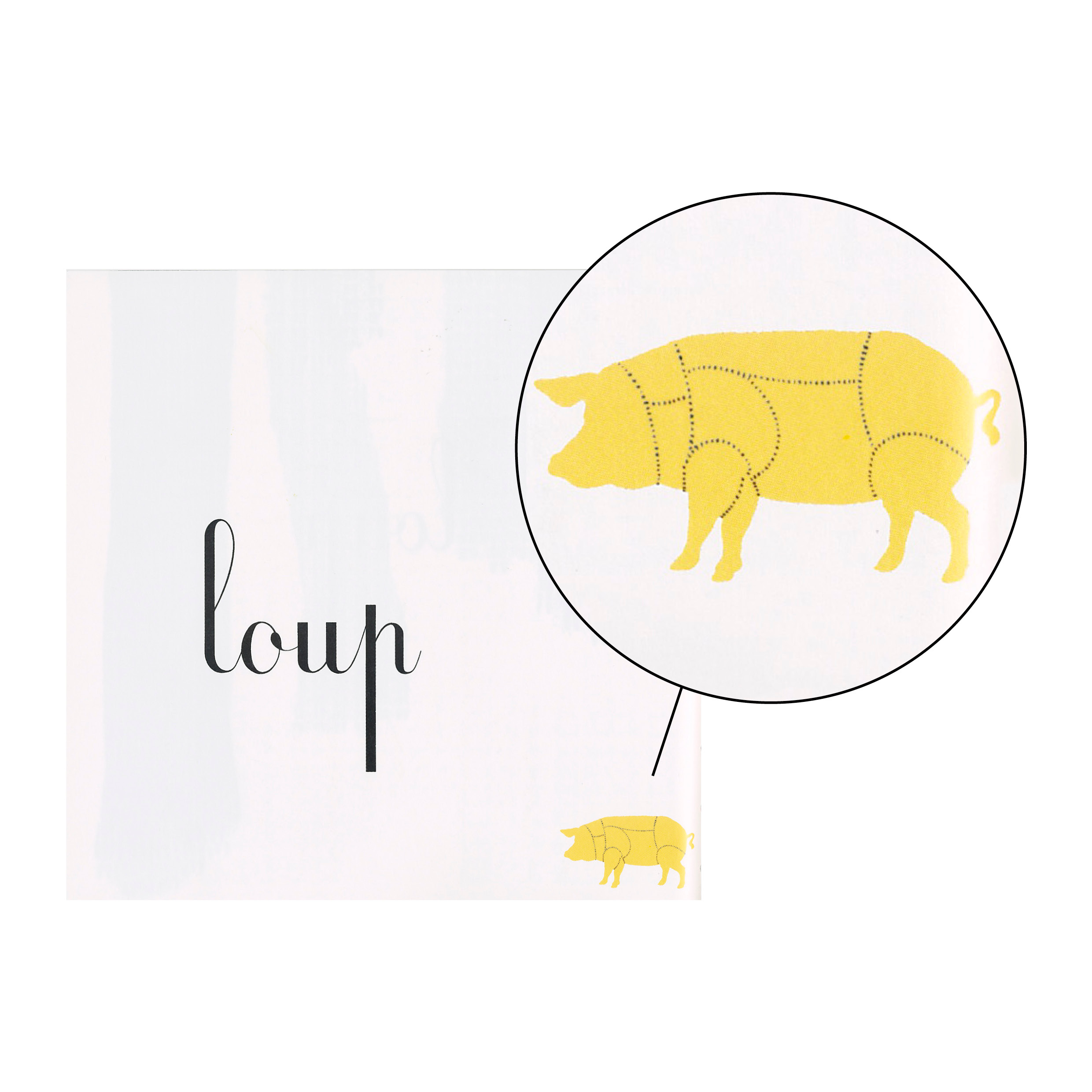 La troisième représentation des cochons est la plus intéressante. Par leur positionnement dans la page, mais aussi par le contenu informatif qu’ils délivrent, les cochons tiennent lieu de légende ou de note en bas de page. Le traitement visuel des deux premiers cochons constitue une référence aux techniques de découpe de viande des bouchers. Rascal fait ainsi une allusion – pouvant faire sourire le lecteur – au sort que réserve le grand méchant loup aux deux cochons. Le cochon rouge, celui qui a construit la maison en pierre, garde le même aplat que sur les pages précédentes, puisqu’il ne connaîtra pas le même sort que ses deux frères. Au contraire, c’est lui qui mangera le loup…